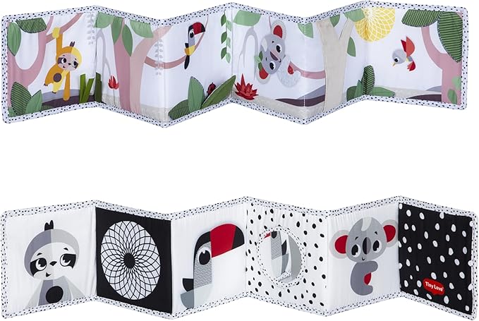 Le livre en tissu Tiny Love peut être déplié en un grand nombre images. Sur le côté noir et blanc, c'est un miroir argenté, et sur le côté coloré, il y a des petits rubans, des rabats crépitants et des textures amusantes avec lesquelles le bébé un peu plus grand peut jouer.