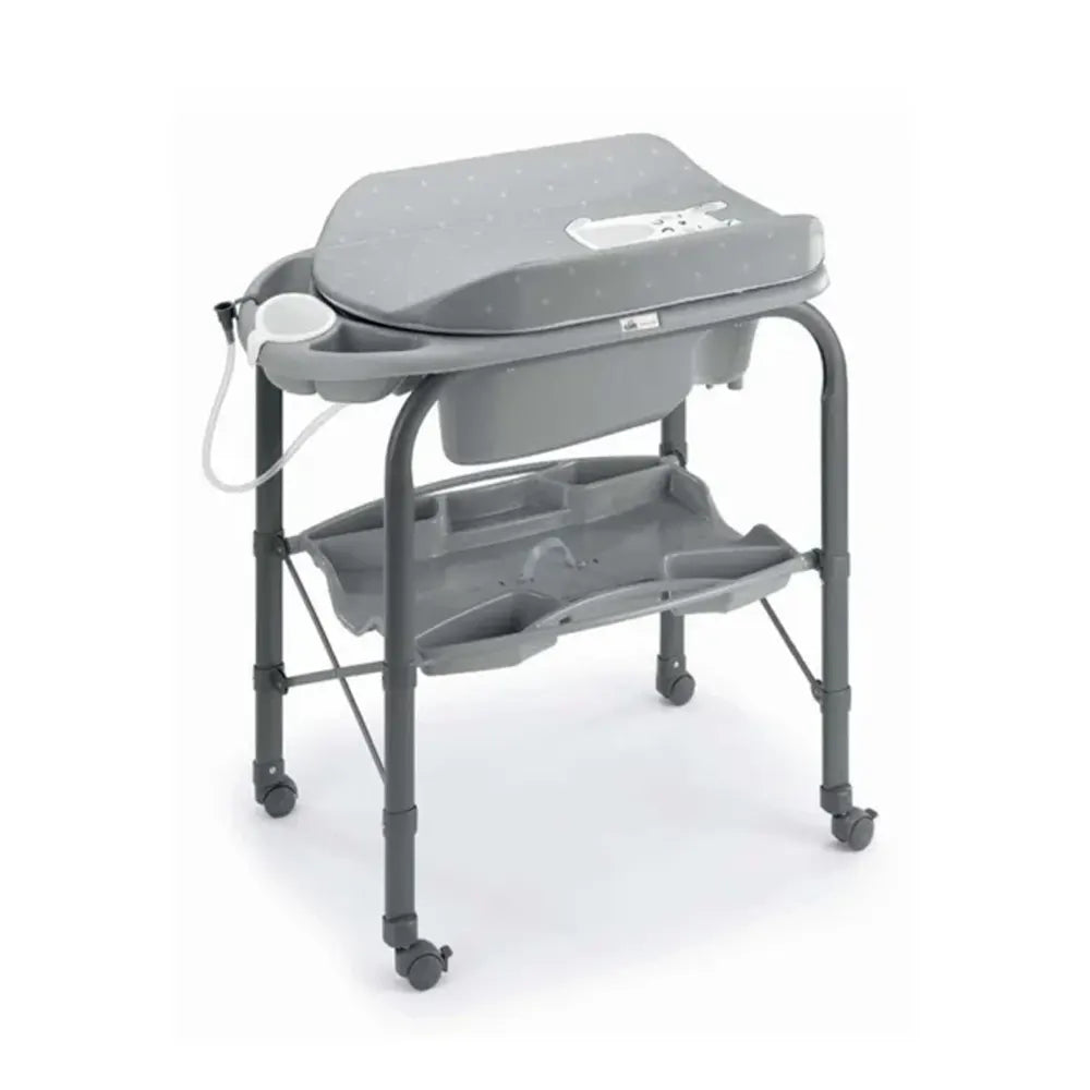Table à langer avec système anti-basculement, équipée de la baignoire Baby Bagno avec 2 assises anatomiques et antidérapantes (une inclinée pour les bébés de 0 à 6 mois et une assise avec accoudoirs pour les bébés de 6 à 12 mois),espaces porte- savon et porte-éponge, petite douche, bouchon et tuyau pour l'évacuation de l'eau, tiroir porte-objets avec porte-flacons, 4 roues dont 2 avec frein.