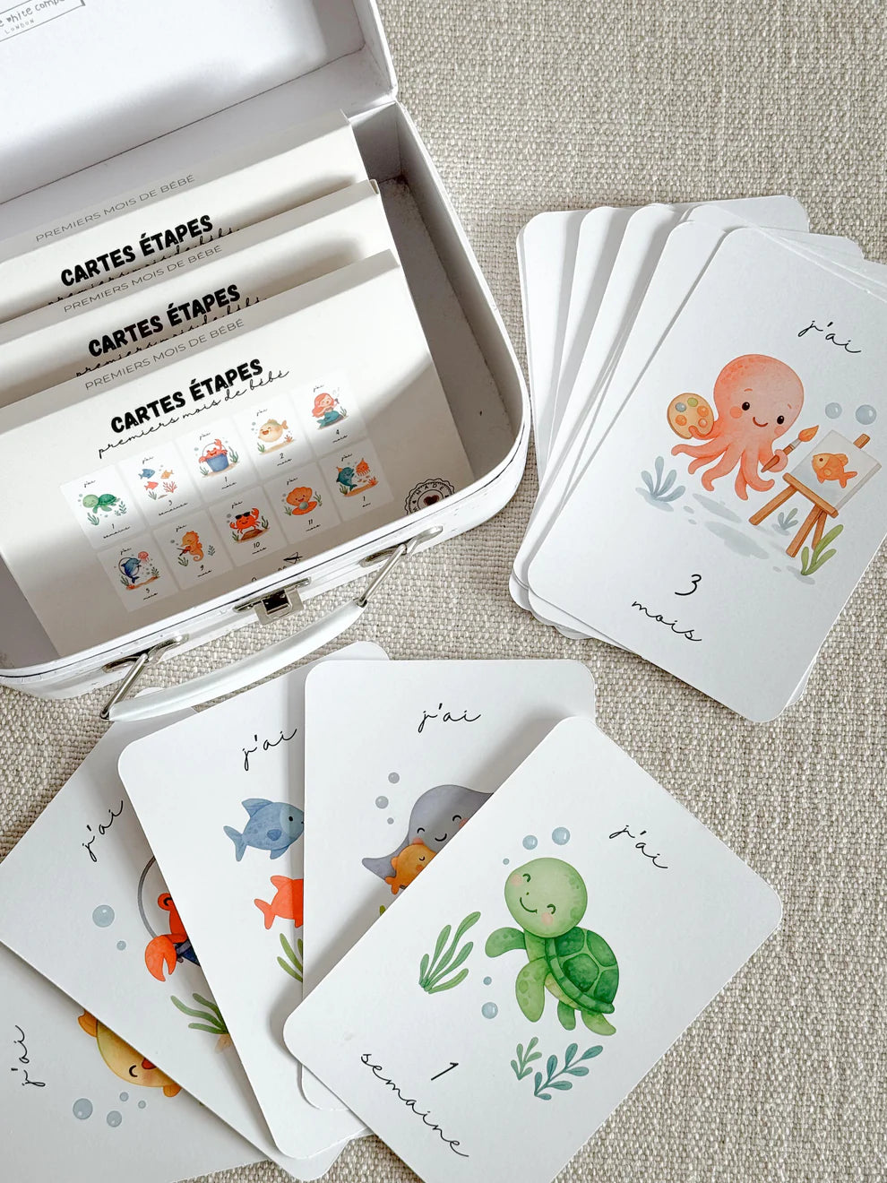 Ce coffret se compose de 15 cartes illustrées au doux thème sous-marin, pour marquer les premières semaines et les premiers mois de bébé.
