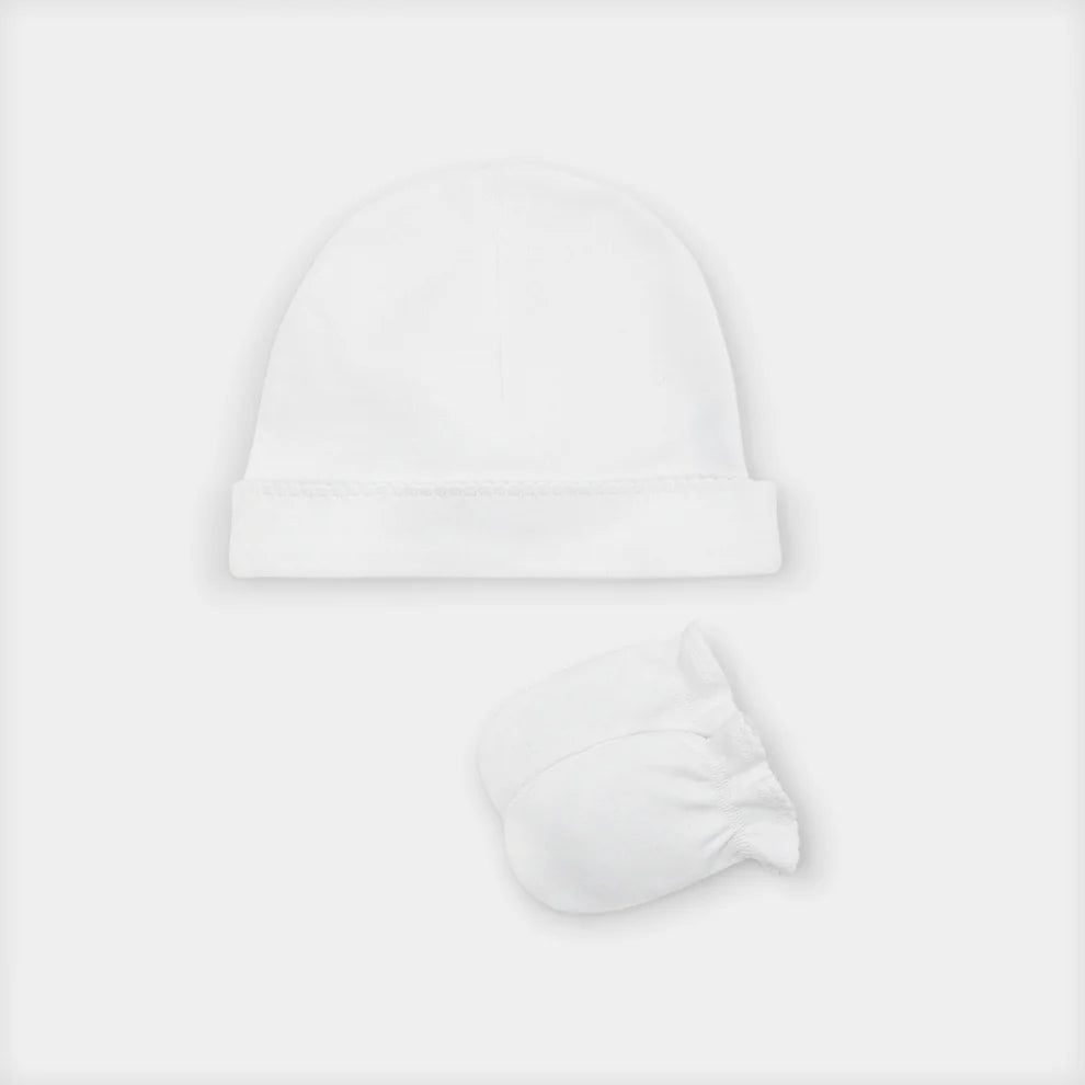 Cet ensemble bonnet et moufles a été pensé pour envelopper les tout-petits dès leurs premières heures. Confectionné en coton biologique tout doux, il est idéal pour protéger la tête et les petites mains de bébé, tout en douceur.