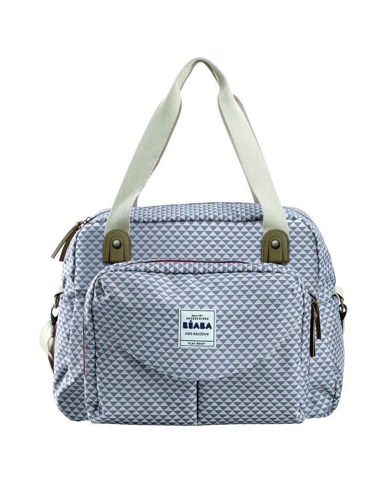 Sac à langer bandoulière bleu marine Genève Béaba avec matelas à langer, pochette à tétine et pochette repas isotherme.