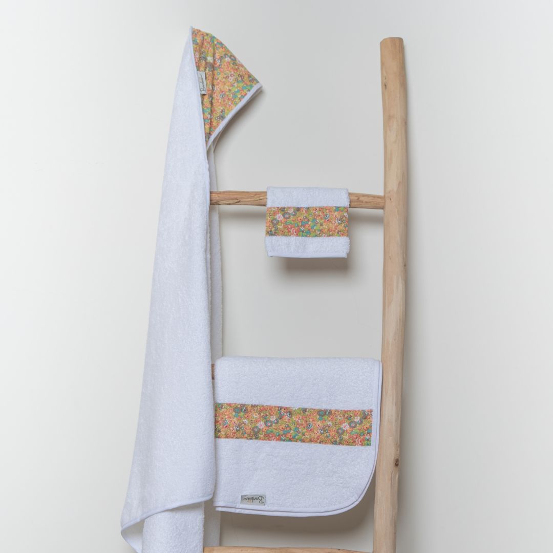 Enveloppez votre bébé à la sortie de son bain dans un joli set de bain assorti, brodé à son nom, composé d'une grande cape de bain, une grande serviette visage et un gant.