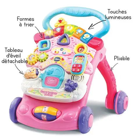 Un super trotteur 2 en 1 pour faire ses premiers pas ! Le Super trotteur parlant accompagne Bébé dans ses premiers apprentissages.