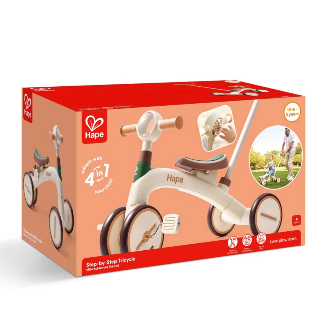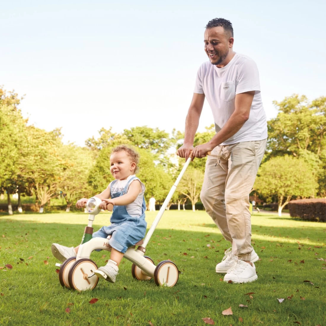 Ce tricycle évolue avec ton enfant et propose 4 modes pour l’aider à trouver son équilibre à chaque étape de son développement : mode poussette, mode trotteur, mode tricycle et mode draisienne.