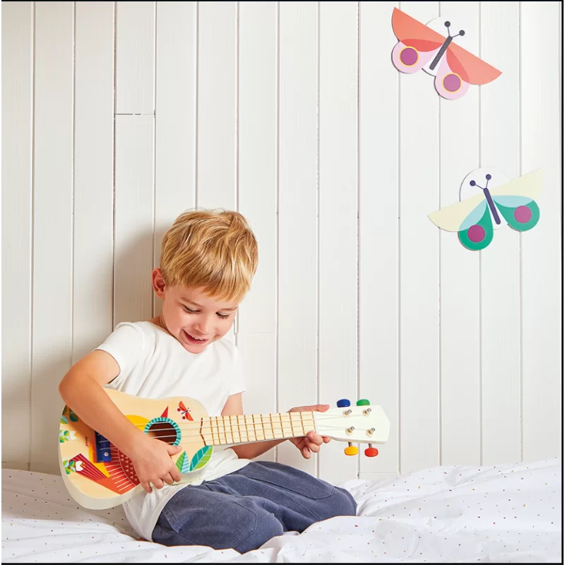 Ce ukulélé en bois est facile à prendre en main, même pour les plus petits, grâce à sa taille adaptée. Un jeu de cordes supplémentaire est inclus dans la boîte. Avec ce jouet musical, les enfants explorent le monde de la musique, développent leur dextérité et même composent leurs propres mélodies ! De plus, ce ukulélé leur permet d'imiter les plus grands en se rêvant star de la chanson ! Avec son design pétillant aux couleurs de la jungle, ce jouet d'imitation séduira les enfants et les parents.